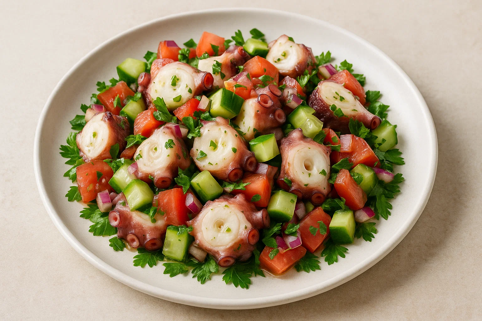 Sada kada imamo savršeno kuhanu, mekanu i ohlađenu hobotnicu, vrijeme je za magiju miješanja. Klasična dalmatinska salata od hobotnice zahtijeva jednostavne, ali svježe i kvalitetne sastojke. U ovom receptu naglasak je na balansu: svježini peršina, pikantnosti kapara i luka, i zemljanoj noti krumpira.