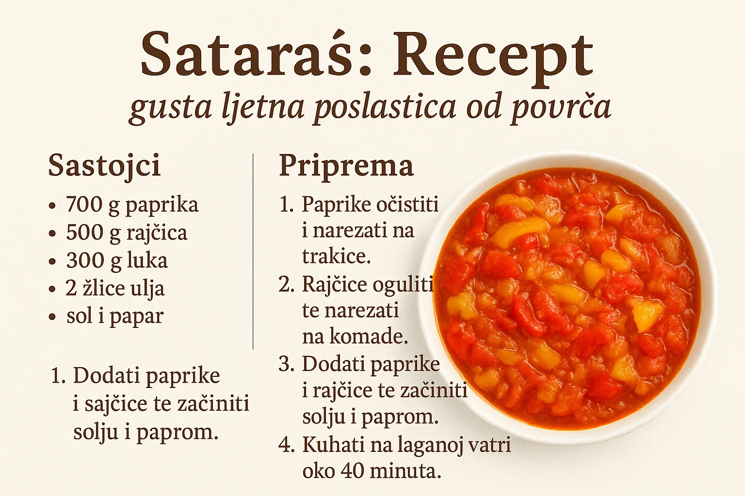 To je udobnost. To je onaj osjećaj kad sjednete za stol, ispred vas je tanjur pun crvene, guste divote, a jedina briga vam je imate li dovoljno kruha za močenje. Ovo jelo, toliko skromno u svojim sastojcima, zapravo je kulinarsko remek-djelo jednostavnosti. Kroz ovaj vodič, neću vam dati samo recept. Pokušat ću vam prenijeti osjećaj sataraša, sve tajne koje sam godinama skupljao, sve greške koje sam pravio i sve trikove koji ga pretvaraju iz “običnog povrća” u gustu ljetnu poslasticu.